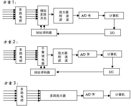 從三種方案的結構框圖我們很明顯的看出他們的區別。分析方案(1):它的主要優點是多路信號共用一路放大模塊成本低,但它的不足之處在于它需要反向控制,也就是它需要一塊I/O卡,尤其關鍵的一點是在這個系統中從電橋輸出的信號特別微弱,而模擬開關切換的信號很容易將該微弱信號淹沒。