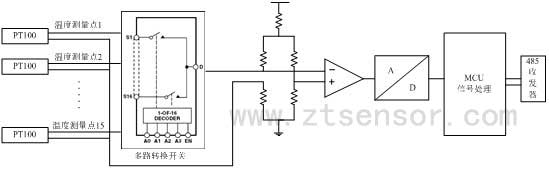使用體積小、重量輕的鉑電阻(Pt100)作為溫度敏感元件,利用大規模集成多路轉換開關分時選通每路溫度信號,然后通過高速模數轉換器將模擬溫度信號轉換為數字信號。通過單片微處理器MCU將信號進行數字濾波,線性校正,偏移補償,最終通過RS485總線將溫度數據以指定的幀格式傳送出去。