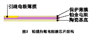 本項目將利用金屬鉑的這種熱電阻制作成薄膜熱電阻。該薄膜熱電阻濺鍍在基底材料上,基底材料可以是金屬材料或者陶瓷。在基底材料上先鍍一層性能優良的絕緣膜,再在其上制作電阻膜。圖3是各種功能薄膜的分布圖。第一層是基底材料,上面依次是絕緣膜、電阻膜、保護膜、引線膜。