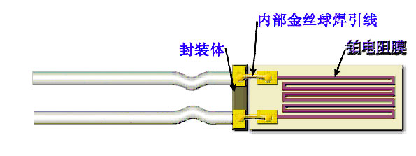 鉑膜熱電阻的溫度測量原理是:熱能 鉑膜電阻值變化。電阻器封裝采用耐溫材料,芯片與封裝體之間的電氣連接采用金絲球焊件,如圖4所示。