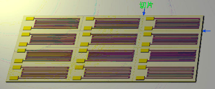 一般選用陶瓷作為基底材料,對于要求快速響應的熱電阻采用導熱性好的金屬材料作基底,經拋光后,在基底材料上沉積一層絕緣膜,然后在絕緣層上濺射鉑電阻膜,經離子束刻蝕成柵條電阻,再在電阻膜層上濺射一層保護絕緣膜。每片基片上可制造10-20支電阻器圖5,芯片制造工藝完成后再進行切片,內引線,封裝,檢測。選用PT100作為溫度敏感元件,精度為1/3B級,溫度誤差為0.3度。該電阻在0攝氏度時電阻為100Ω。由于產品工作在-150℃~150℃,且引線長度為0.5m,因此引線選用溫度適用范圍寬的特氟龍F4,它可以制成外徑很細的線纜,質量輕。每只溫度PT100鉑膜熱電阻和導線總重控制在1g~1.2g。