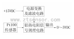 燃油溫度信號變送器的作用是將燃油溫度傳感器在-55℃~300℃范圍內(nèi)隨溫度變化的鉑熱電阻值變換為隨溫度變化的電壓信號并進(jìn)行放大與線性修正,轉(zhuǎn)換為0~5VDC電壓信號輸出。燃油溫度信號變送器采用專用鉑電阻信號調(diào)理集成電路并配以少量精密電子元器件,因此電路結(jié)構(gòu)簡單,性能穩(wěn)定可靠。原理框圖如圖1所示。