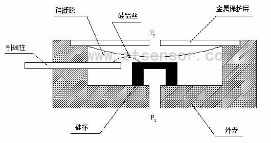 通過硅平面集成工藝技術在硅片上制作四個擴散電阻作為應力敏感元件,用機械研磨加各向同性化學腐蝕方法將硅襯底加工成周邊固支的平膜片彈性力學結構。四個力敏電阻,連成惠斯頓全橋應變電路,這種電路具有最高的靈敏度、最好的溫度補償性能和最高的輸出線性度。硅杯受到一個差值壓力,力敏電阻的電阻率改變,引起電阻阻值改變。電阻率的改變是由于硅膜片的形變引起的,測試端P1與引壓端P2的壓力差與硅膜片的形變成正比,也就是電橋的輸出與壓力差成正比。