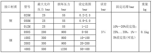 可調(diào)機械壓力開關(guān)內(nèi)置活塞與精密彈簧相連,當壓力變化時,彈簧伸縮量發(fā)生相應變化,當壓力達到設(shè)定值時,會觸發(fā)預設(shè)的機械結(jié)構(gòu)并發(fā)出開關(guān)信號。產(chǎn)品結(jié)構(gòu)緊湊,采用DIN標準插頭,接線極其方便,測量范圍廣(0...400bar),過載能力高(可高達:1230 bar),高重復性,具有常開或常閉觸點,接點鍍金, 觸點容量大。可用于:水、油、氣體壓力的測量。