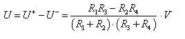 膜片進一步減薄,非線性將急劇增大,要保證微小量程的傳感器靈敏度不小于0.8mV/V,其非線性將達到15%左右。嚴重的非線性是后續電路無法補嘗的,因此必須解決傳感器芯片本身的非線性問題。下面給出壓力傳感器的非線性理論計算公式。傳感器電橋由四個橋臂R1,R2,R3,R4組成。供橋電源電壓為V,在R1和R4上的分壓分別為U+和U-,即: